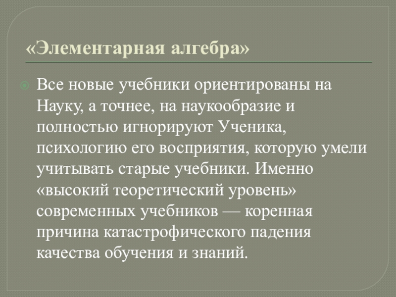 и полностью игнорируют Ученика, психологию его восприятия, которую умели учитывать старые учебники. Именно «высокий теоретический уровень» современных учебников — коренная причина катастрофического падения качества обучения и знаний.