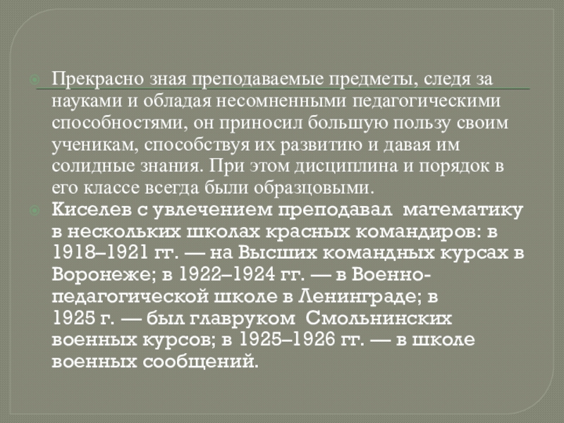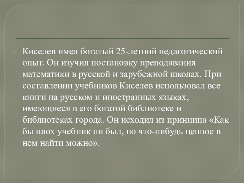 Слайд 18Киселев имел богатый 25-летний педагогический опыт. Он изучил постановку преподавания математики