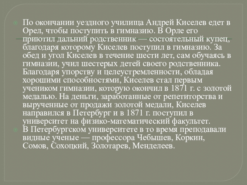 в гимназию. В Орле его приютил дальний родственник — состоятельный купец, благодаря которому Киселев поступил в гимназию. За обед и угол Киселев в течение шести лет, сам обучаясь в гимназии, учил шестерых детей своего родственника. Благодаря упорству и целеустремленности, обладая хорошими способностями, Киселев стал первым учеником гимназии, которую окончил в 1871 г. с золотой медалью. На деньги, заработанные от репетиторства и вырученные от продажи золотой медали, Киселев направился в Петербург и в 1871 г. поступил в университет на физико-математический факультет.