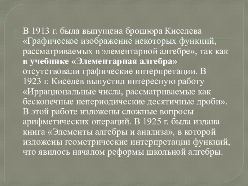 в элементарной алгебре», так как в учебнике «Элементарная алгебра» отсутствовали графические интерпретации. В 1923 г. Киселев выпустил интересную работу «Иррациональные числа, рассматриваемые как бесконечные непериодические десятичные дроби». В этой работе изложены сложные вопросы арифметических операций. В 1925 г. была издана книга «Элементы алгебры и анализа», в которой изложены геометрические интерпретации функций, что явилось началом реформы школьной алгебры.