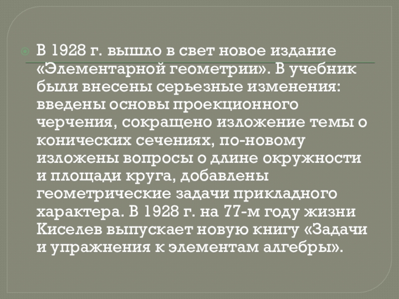 были внесены серьезные изменения: введены основы проекционного черчения, сокращено изложение темы о конических сечениях, по-новому изложены вопросы о длине окружности и площади круга, добавлены геометрические задачи прикладного характера. В 1928 г. на 77-м году жизни Киселев выпускает новую книгу «Задачи и упражнения к элементам алгебры».
