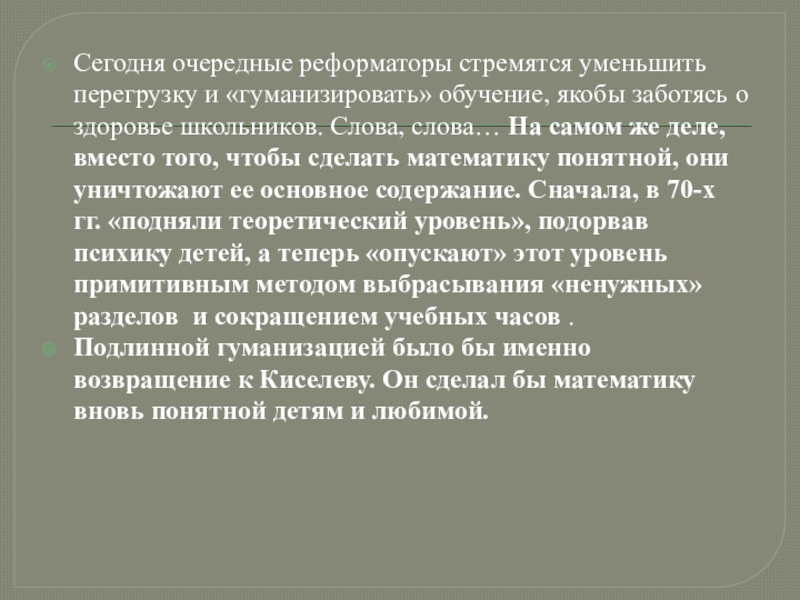 Подлинной гуманизацией было бы именно возвращение к Киселеву. Он сделал бы математику вновь понятной детям и любимой.