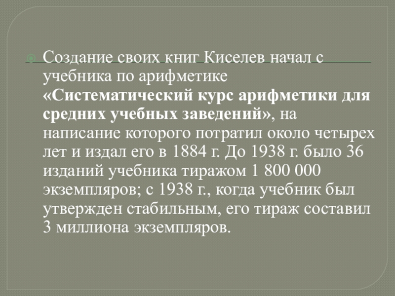 Слайд 10Создание своих книг Киселев начал с учебника по арифметике «Систематический курс