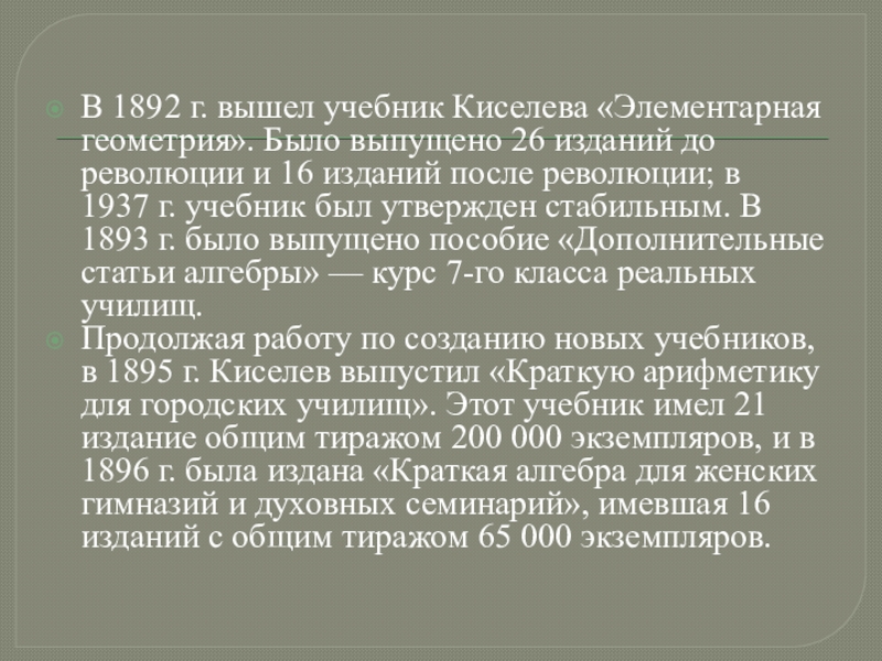 Слайд 12В 1892 г. вышел учебник Киселева «Элементарная геометрия». Было выпущено 26 изданий