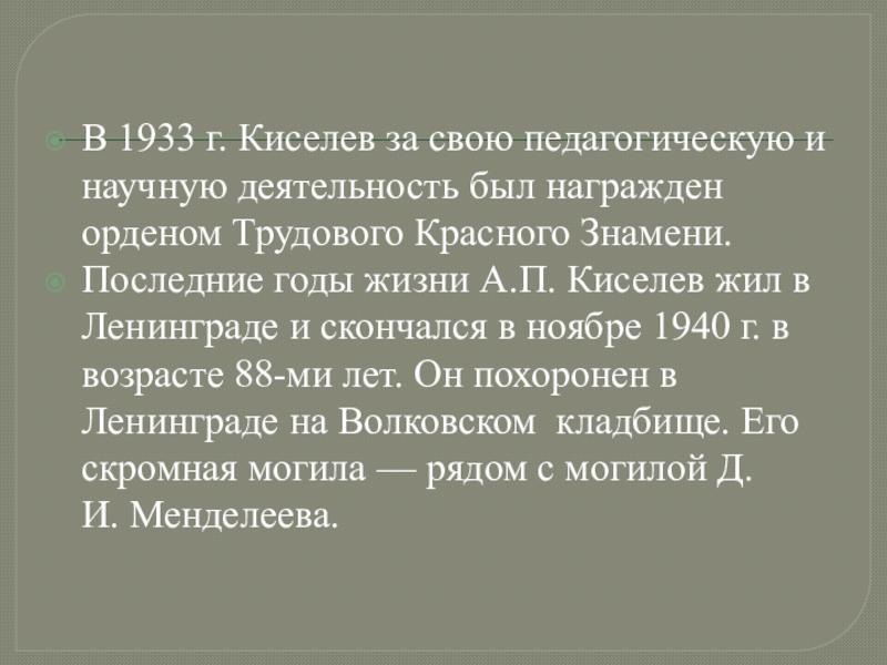 Слайд 7В 1933 г. Киселев за свою педагогическую и научную деятельность был награжден