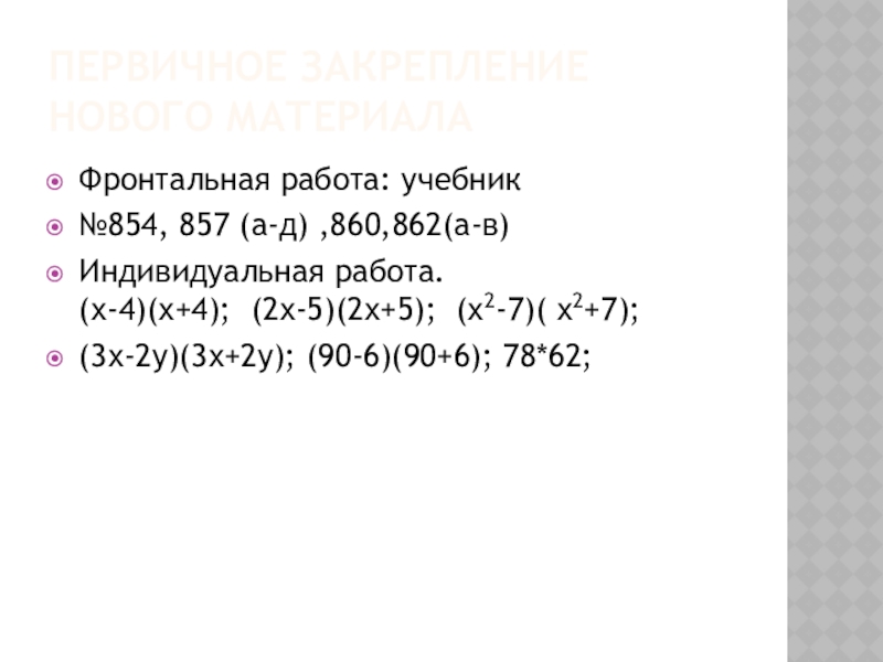 Первичное закрепление нового материалаФронтальная работа: учебник №854, 857 (а-д) ,860,862(а-в)Индивидуальная работа. (х-4)(х+4); (2х-5)(2х+5); (х2-7)( х2+7); (3х-2у)(3х+2у); (90-6)(90+6);