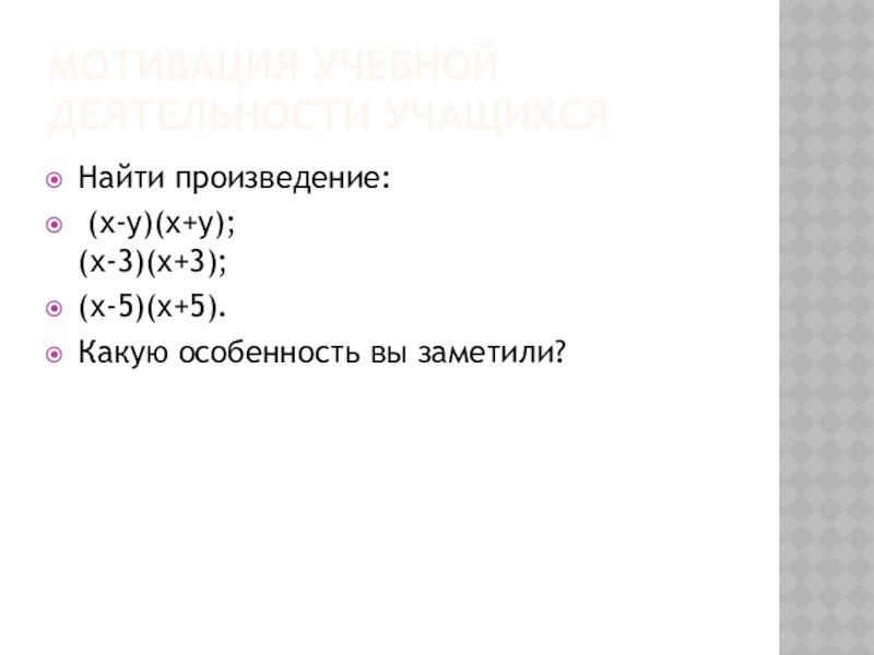 Мотивация учебной деятельности учащихсяНайти произведение: (х-у)(х+у); (х-3)(х+3); (х-5)(х+5).Какую особенность вы заметили?
