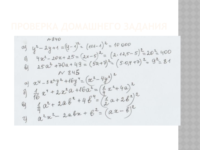 Устная работа. Разложить на множители:х2+2х+1; у2-4у+4; у2+6у+9; у2-10у+25; у2-12у+36; у2+18у+81