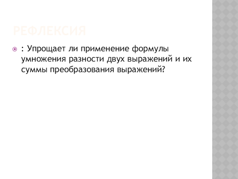 Рефлексия: Упрощает ли применение формулы умножения разности двух выражений и их суммы преобразования выражений?