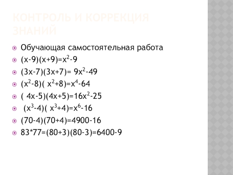 Контроль и коррекция знанийОбучающая самостоятельная работа(х-9)(х+9)=х2-9(3х-7)(3х+7)= 9х2-49(х2-8)( х2+8)=х4-64( 4х-5)(4х+5)=16х2-25 (х3-4)( х3+4)=х6-16(70-4)(70+4)=4900-1683*77=(80+3)(80-3)=6400-9