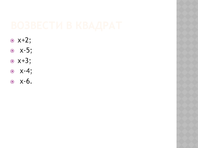 Возвести в квадратх+2; х-5; х+3; х-4; х-6.