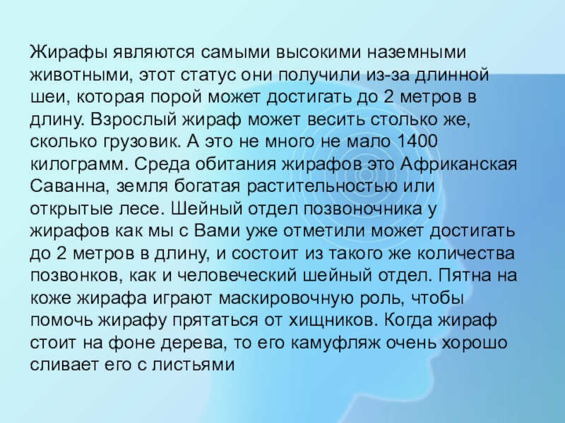 длинной шеи, которая порой может достигать до 2 метров в длину. Взрослый жираф может весить столько же, сколько грузовик. А это не много не мало 1400 килограмм. Среда обитания жирафов это Африканская Саванна, земля богатая растительностью или открытые лесе. Шейный отдел позвоночника у жирафов как мы с Вами уже отметили может достигать до 2 метров в длину, и состоит из такого же количества позвонков, как и человеческий шейный отдел. Пятна на коже жирафа играют маскировочную роль, чтобы помочь жирафу прятаться от хищников. Когда жираф стоит на фоне дерева, то его камуфляж очень хорошо сливает его с листьями