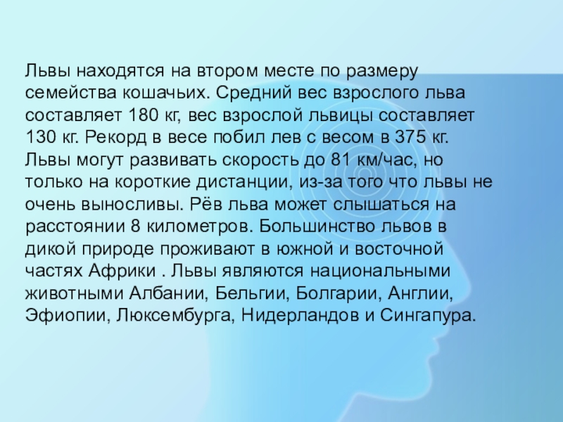 взрослого льва составляет 180 кг, вес взрослой львицы составляет 130 кг. Рекорд в весе побил лев с весом в 375 кг. Львы могут развивать скорость до 81 км/час, но только на короткие дистанции, из-за того что львы не очень выносливы. Рёв льва может слышаться на расстоянии 8 километров. Большинство львов в дикой природе проживают в южной и восточной частях Африки . Львы являются национальными животными Албании, Бельгии, Болгарии, Англии, Эфиопии, Люксембурга, Нидерландов и Сингапура.