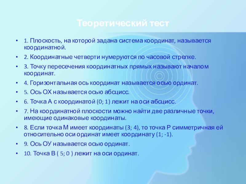 10. Точка В ( 5; 0 ) лежит на оси ординат.
