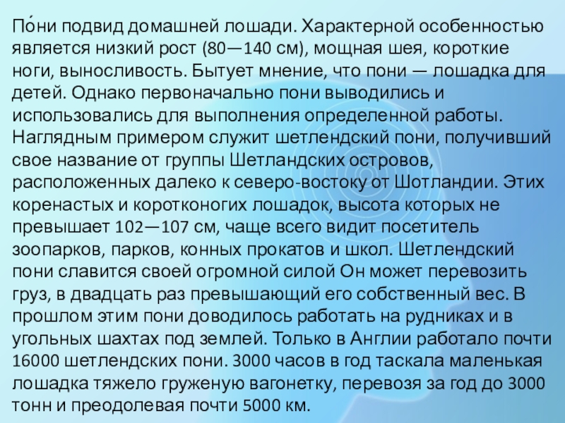 мощная шея, короткие ноги, выносливость. Бытует мнение, что пони — лошадка для детей. Однако первоначально пони выводились и использовались для выполнения определенной работы. Наглядным примером служит шетлендский пони, получивший свое название от группы Шетландских островов, расположенных далеко к северо-востоку от Шотландии. Этих коренастых и коротконогих лошадок, высота которых не превышает 102—107 см, чаще всего видит посетитель зоопарков, парков, конных прокатов и школ. Шетлендский пони славится своей огромной силой Он может перевозить груз, в двадцать раз превышающий его собственный вес. В прошлом этим пони доводилось работать на рудниках и в угольных шахтах под землей. Только в Англии работало почти 16000 шетлендских пони. 3000 часов в год таскала маленькая лошадка тяжело груженую вагонетку, перевозя за год до 3000 тонн и преодолевая почти 5000 км.
