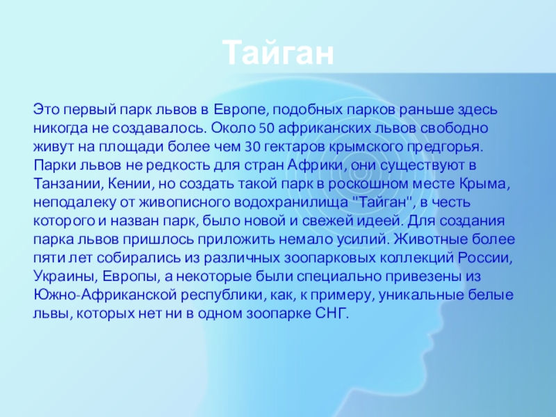 не создавалось. Около 50 африканских львов свободно живут на площади более чем 30 гектаров крымского предгорья. Парки львов не редкость для стран Африки, они существуют в Танзании, Кении, но создать такой парк в роскошном месте Крыма, неподалеку от живописного водохранилища "Тайган", в честь которого и назван парк, было новой и свежей идеей. Для создания парка львов пришлось приложить немало усилий. Животные более пяти лет собирались из различных зоопарковых коллекций России, Украины, Европы, а некоторые были специально привезены из Южно-Африканской республики, как, к примеру, уникальные белые львы, которых нет ни в одном зоопарке СНГ.