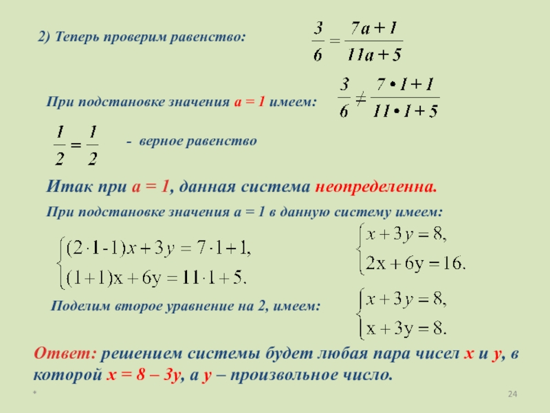 Ответ: решением системы будет любая пара чисел х и у, в которой х = 8 – 3у, а у – произвольное число.