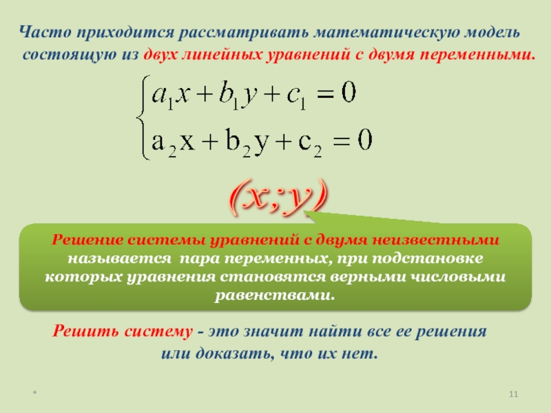 Решение системы уравнений с двумя неизвестными называется пара переменных, при подстановке которых уравнения становятся верными числовыми равенствами.