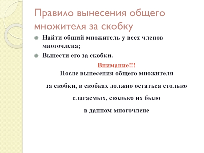 Правило вынесения общего множителя за скобкуНайти общий множитель у всех членов многочлена;Вынести его за скобки.Внимание!!!После вынесения общего