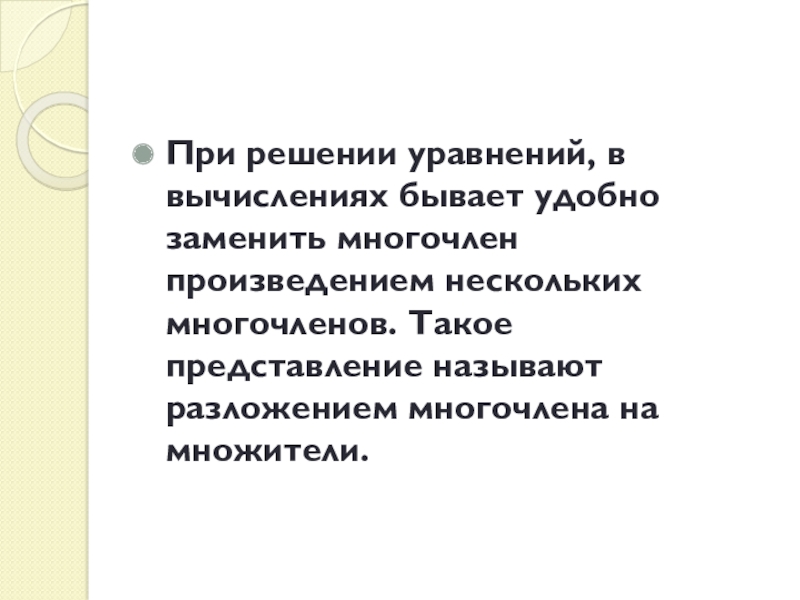При решении уравнений, в вычислениях бывает удобно заменить многочлен произведением нескольких многочленов. Такое представление называют разложением многочлена
