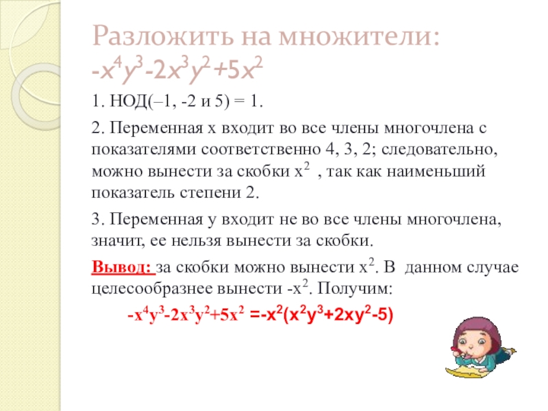 Разложить на множители: -x4y3-2x3y2+5x21. НОД(–1, -2 и 5) = 1.2. Переменная x входит во все члены многочлена