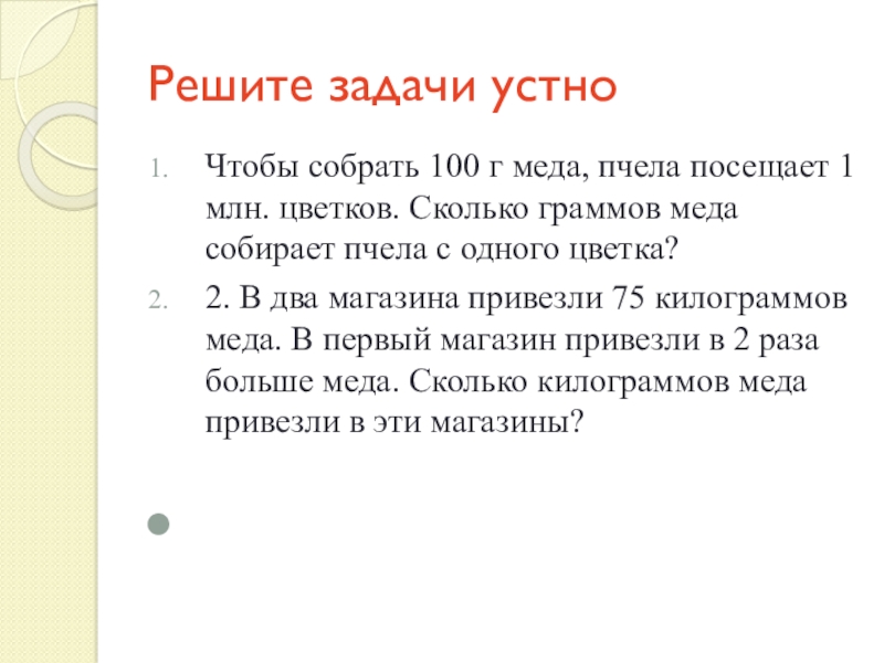 Решите задачи устноЧтобы собрать 100 г меда, пчела посещает 1 млн. цветков. Сколько граммов меда собирает пчела с одного цветка?2. В два магазина привезли 75 килограммов меда. В первый магазин привезли в 2 раза больше меда.