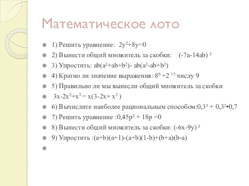 Математическое лото1) Решить уравнение: 2y2+8y=02) Вынести общий множитель за скобки:  (-7а-14аb) ²3) Упростить: ab(a²+ab+b²)- ab(a²-ab+b²)4) Кратно ли