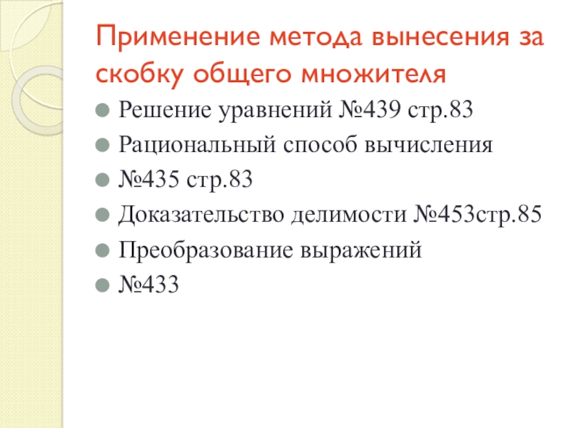 Применение метода вынесения за скобку общего множителяРешение уравнений №439 стр.83Рациональный способ вычисления№435 стр.83Доказательство делимости №453стр.85Преобразование выражений№433