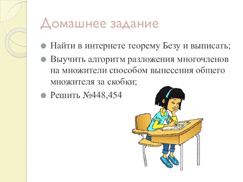 Домашнее заданиеНайти в интернете теорему Безу и выписать;Выучить алгоритм разложения многочленов на множители способом вынесения общего множителя