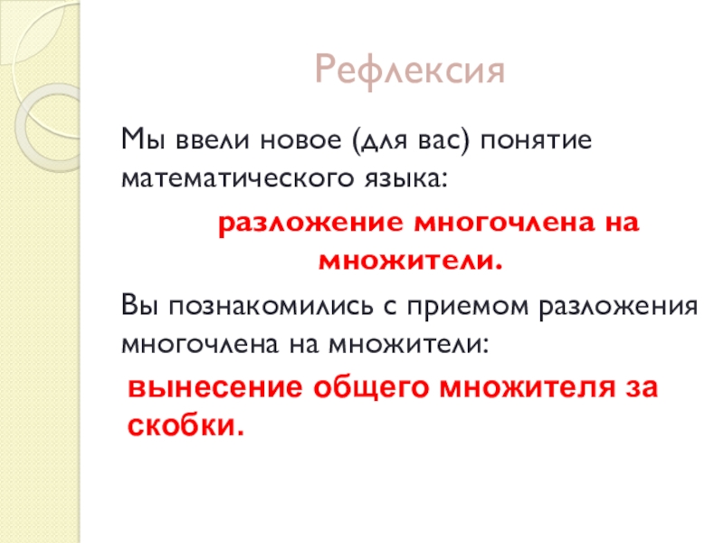 РефлексияМы ввели новое (для вас) понятие математического языка:	разложение многочлена на множители.Вы познакомились с приемом разложения многочлена на
