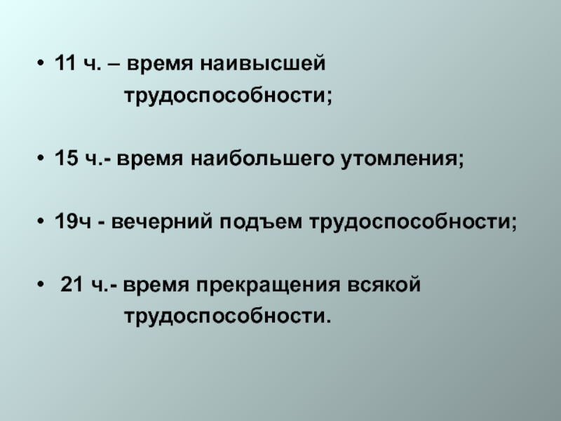 11 ч. – время наивысшей         трудоспособности;15 ч.- время наибольшего