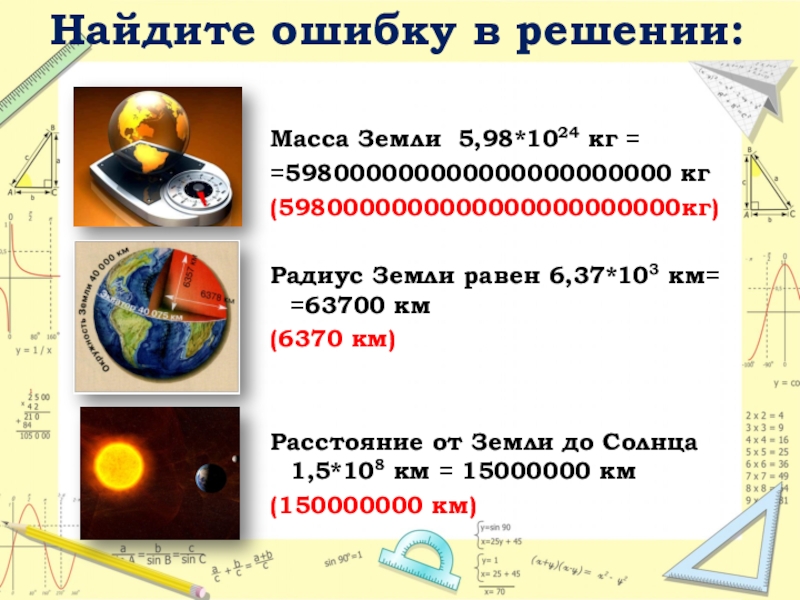 Найдите ошибку в решении:Масса Земли 5,98*1024 кг ==598000000000000000000000 кг(5980000000000000000000000кг)Радиус Земли равен 6,37*103 км= =63700 км(6370 км)Расстояние от