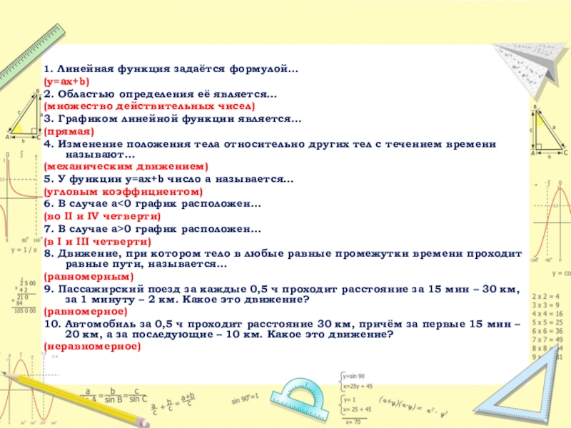 1. Линейная функция задаётся формулой…(y=ax+b)2. Областью определения её является… (множество действительных чисел)3. Графиком линейной функции является…(прямая)4. Изменение