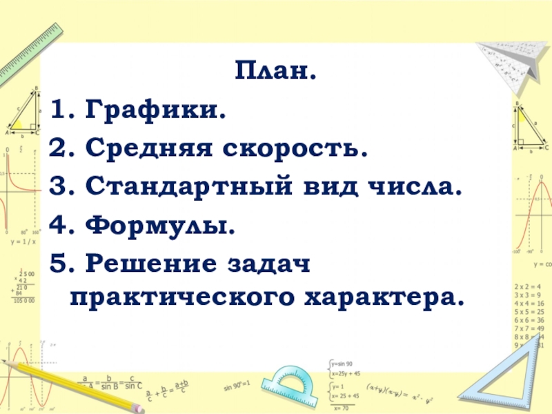 План.1. Графики.2. Средняя скорость.3. Стандартный вид числа.4. Формулы.5. Решение задач практического характера.