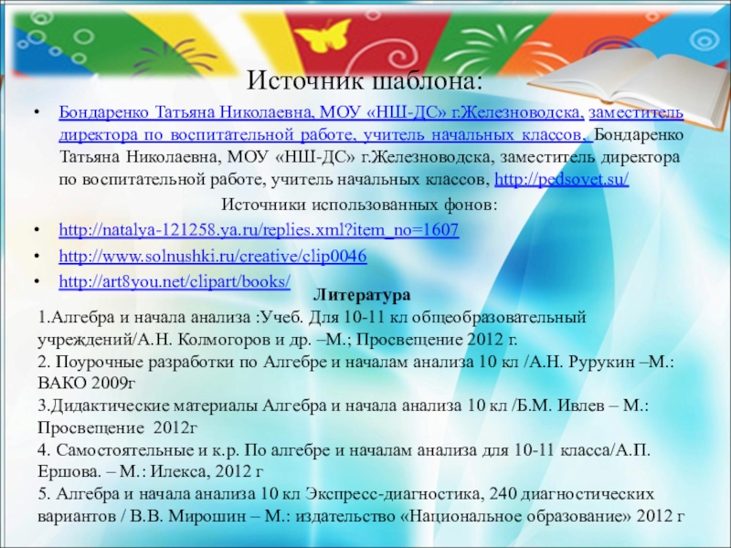 1.Алгебра и начала анализа :Учеб. Для 10-11 кл общеобразовательный учреждений/А.Н. Колмогоров и др. –М.; Просвещение 2012 г.