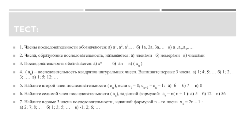 2. Числа, образующие последовательность, называются: а) членами б) номерами в) числами