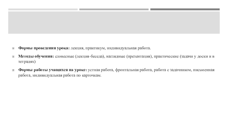 Слайд 4Формы проведения урока: лекция, практикум, индивидуальная работа.