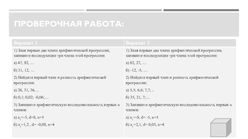 среди последовательностей арифметическую прогрессию, находить разность арифметической прогрессии, а также записывать конечную арифметическую прогрессию при заданных условиях.