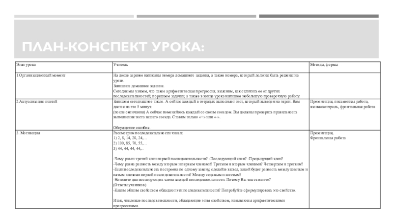Образовательные: введение понятий «арифметической прогрессии», «разности арифметической прогрессии», формирование умения выделять