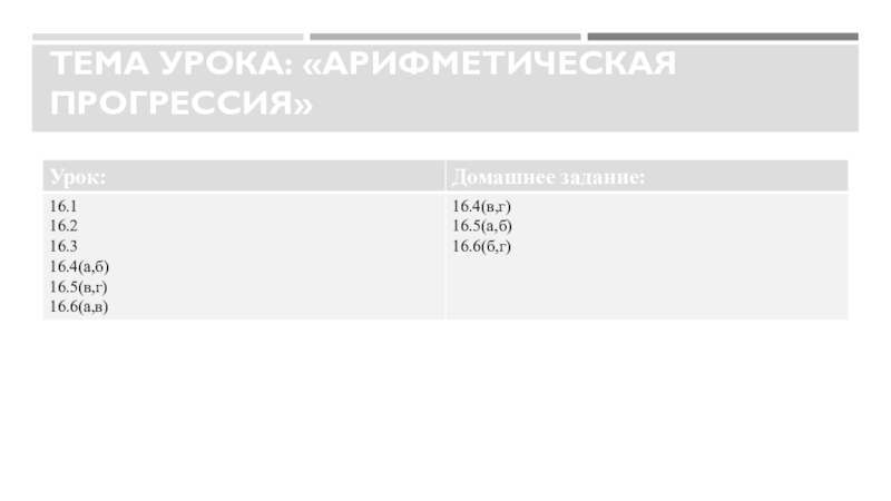 Слайд 9Тема урока: «Арифметическая прогрессия»