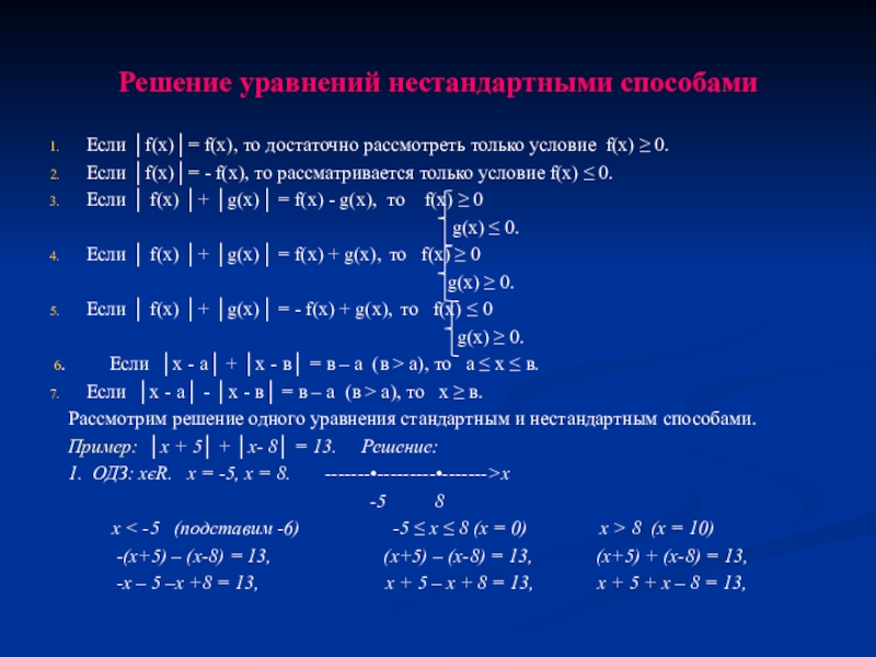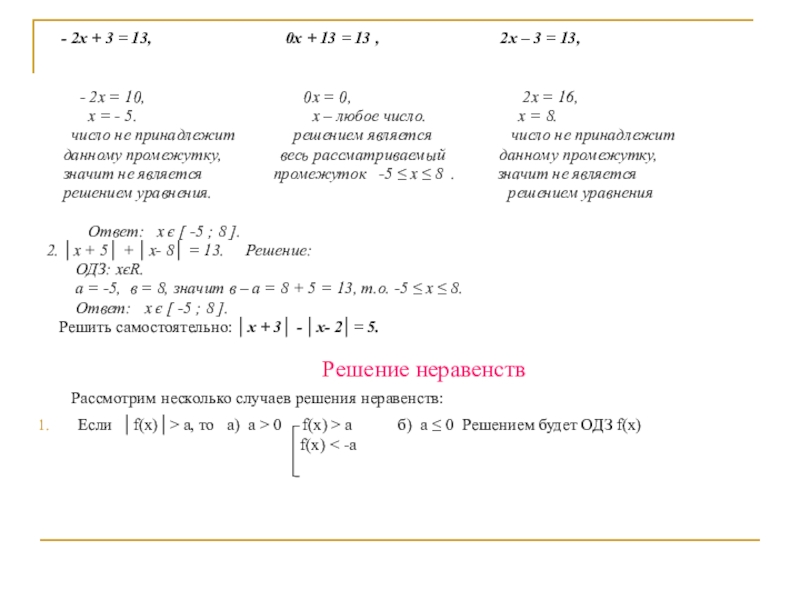2. │х + 5│ + │х- 8│ = 13. Решение: