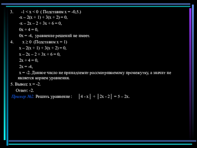 Х < -2. (Раскроем модуль. Возьмем например число х = -3 и подставим в уравнение. Если выражение, стоящее под знаком модуля положительно, то знак модуля не меняется, если отрицательно – знак модуля меняется на противоположный.)