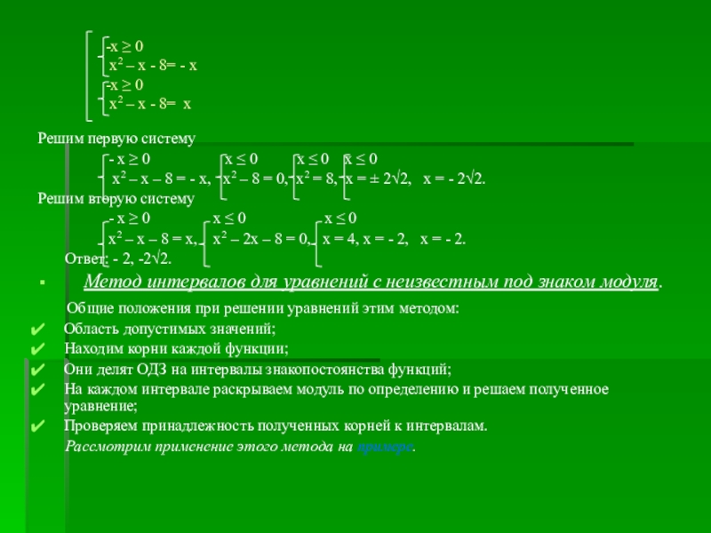 х2 – х – 8 = - х, х2 – 8 = 0, х2 = 8, х = ± 2√2, х = - 2√2.