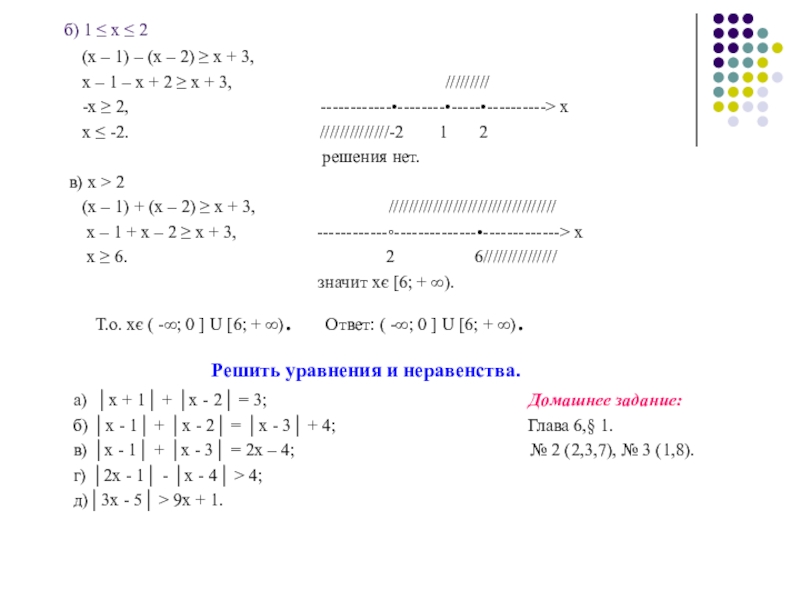 Пример №2. Решить уравнение : │4 - х│ + │2х - 2│ = 5 – 2х.