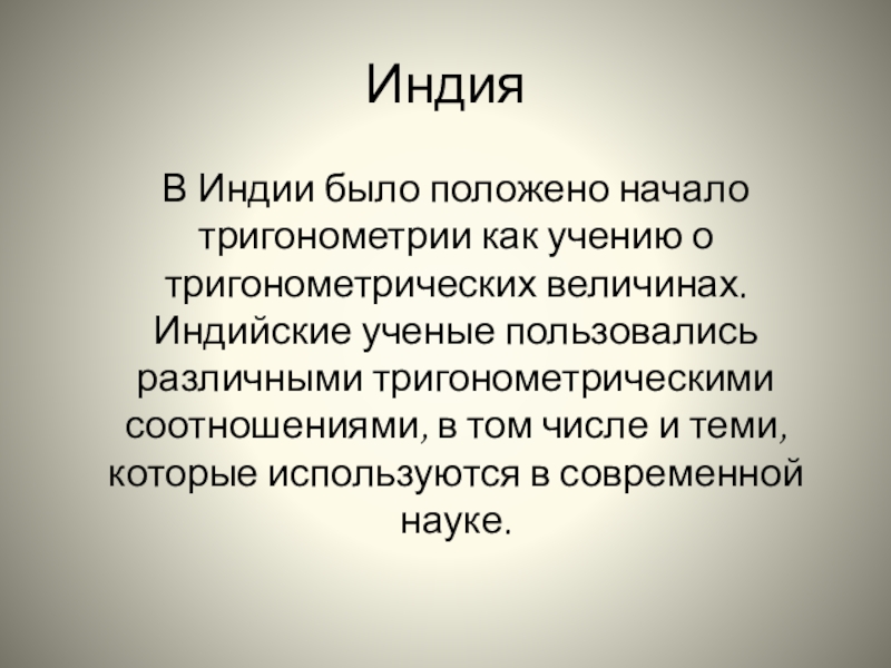 Индийские ученые пользовались различными тригонометрическими соотношениями, в том числе и теми, которые используются в современной науке.