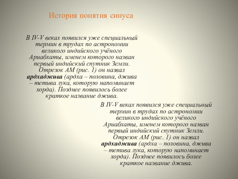 В IV-V веках появился уже специальный термин в трудах по астрономии великого индийского учёного Ариабхаты, именем которого назван первый индийский спутник Земли. Отрезок АМ (рис. 1) он назвал ардхаджива (ардха – половина, джива – тетива лука, которую напоминает хорда). Позднее появилось более краткое название джива.