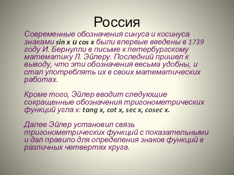 Кроме того, Эйлер вводит следующие сокращенные обозначения тригонометрических функций угла x: tang x, cot x, sec x, cosec x.