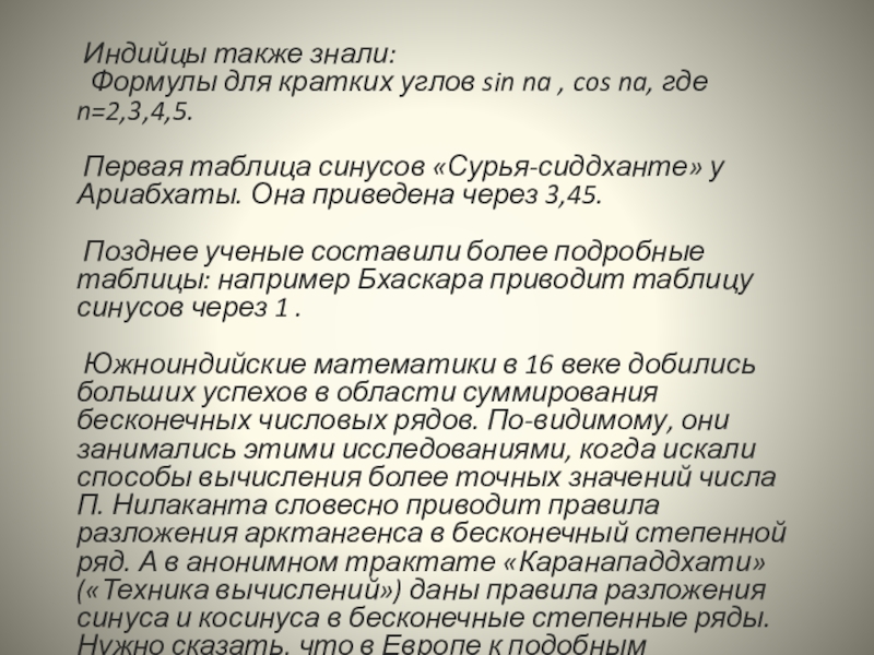 Южноиндийские математики в 16 веке добились больших успехов в области суммирования бесконечных числовых рядов. По-видимому, они занимались этими исследованиями, когда искали способы вычисления более точных значений числа П. Нилаканта словесно приводит правила разложения арктангенса в бесконечный степенной ряд. А в анонимном трактате «Каранападдхати» («Техника вычислений») даны правила разложения синуса и косинуса в бесконечные степенные ряды. Нужно сказать, что в Европе к подобным результатам подошли лишь в 17-18