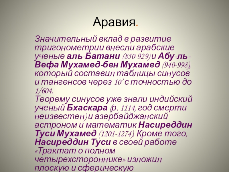 Значительный вклад в развитие тригонометрии внесли арабские ученые аль-Батани