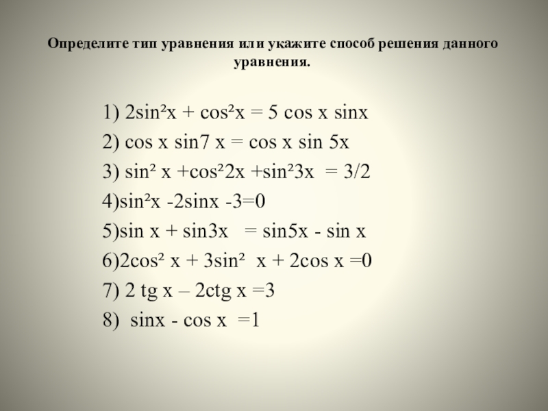 Слайд 4Определите тип уравнения или укажите способ решения данного уравнения.